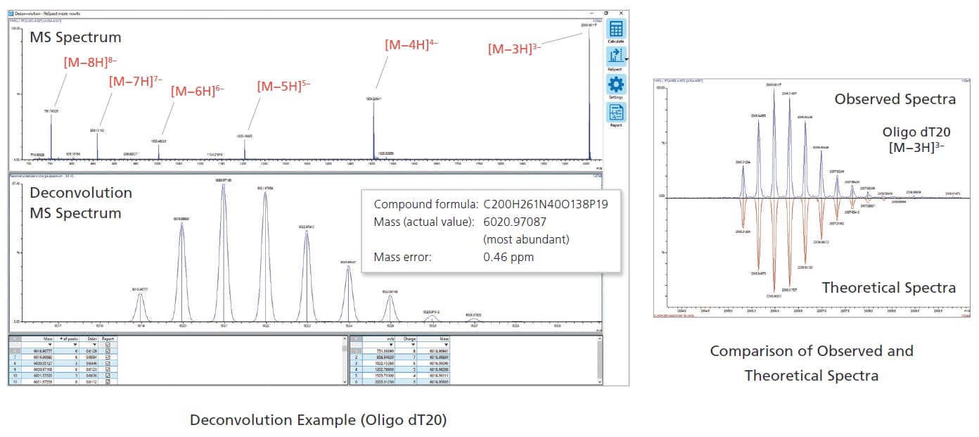 For the deconvolution of multiple charge state envelopes produced by large molecules, such as proteins and oligonucleotides, LabSolutions Insight Explore CSD includes ReSpect™. This multivalent ion analysis algorithm from Positive Probability Ltd detects related multi-charged peaks and calculates the mass of the original species. Excellent mass accuracy was obtained in the example below.